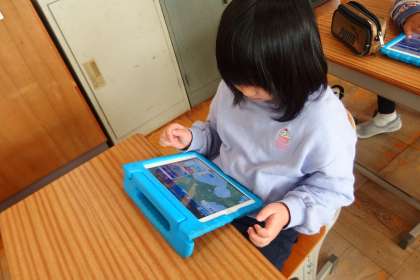 災害から身を守るための情報をタブレットから得られるように、その方法を学んでいる4年生です。