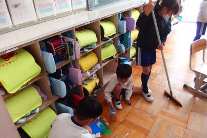 図工の授業のあとで掃除をしている1年生。 AIBAN