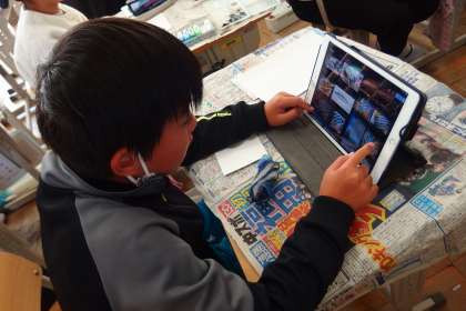 水彩画の題材をタブレットで探す6年生。 SUISAIGA