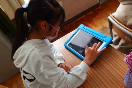 地域の偉人である清水陳平さんについてタブレットで調べている4年生です。
