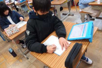 タブレットから連絡を写している4年生です。
