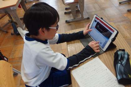タブレットで発表用プレゼンを作成中の5年生です。