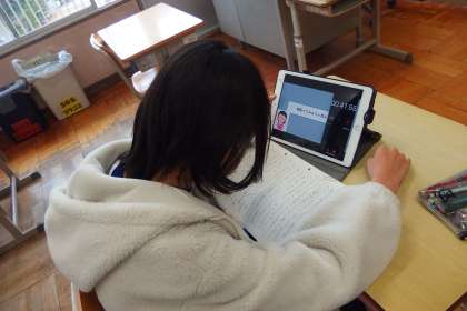 タブレットで発表用プレゼンを作成中の5年生です。