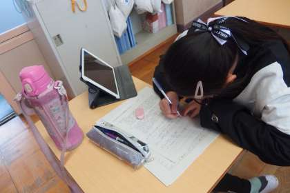 タブレットで発表用プレゼンを作成中の5年生です。