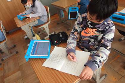 タブレットから連絡を写している4年生です。