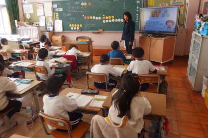 1年生の算数の授業です。 電子黒板に映っているのはデジタル教科書です。