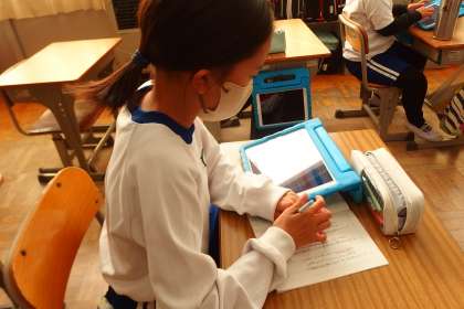 タブレットから連絡を写す4年生です。
