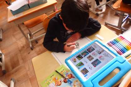 タブレットで調べたことを参考にして、表現活動に使うシートを作っています。