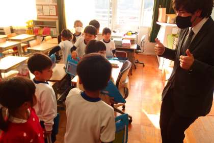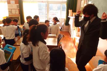 1年生の外国語活動の授業です。 ALTの先生と一緒に学び合い。