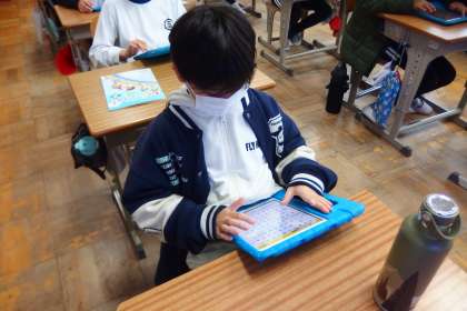 タブレットのアプリで復習をしている4年生です。
