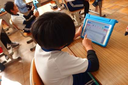 給食の食材情報をタブレットで調べている4年生です。