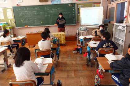 4年生の算数の授業です。 担任の先生がタブレットでデジタル教科書を提示しています。