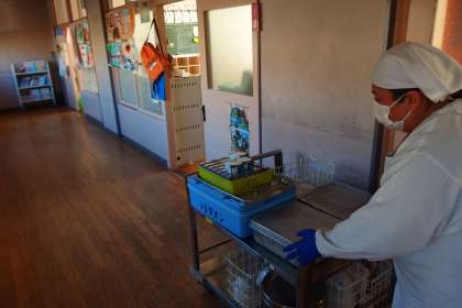 4時間目の終わりが近づくと公務手さんたちが給食のワゴンを各教室の前まで運んでくれます。