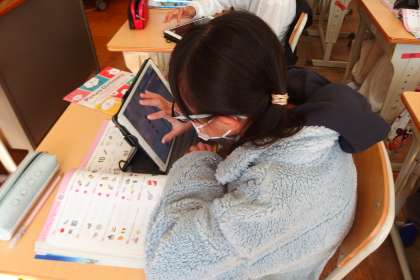 6年生の英語の授業です。 ALTとの会話活動のためにタブレットに資料を準備しています。