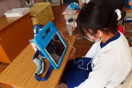 タブレットを使って理科の調べ学習を進めている4年生です。