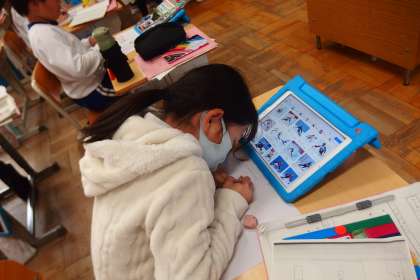 3年生がタブレットを参考にしながらパラスポーツについてまとめていました。