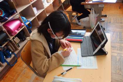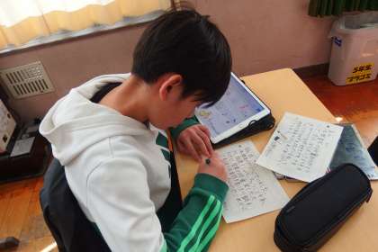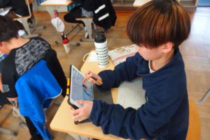 タブレットであれこれ調べながら手紙を書いている5年生。