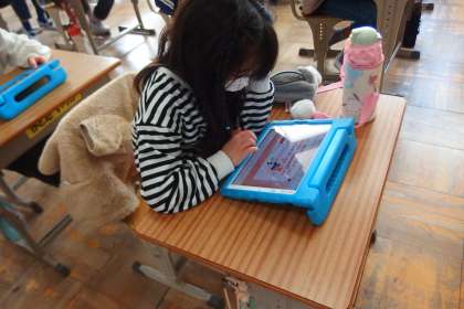 タブレットでアンケートに答えている4年生です。
