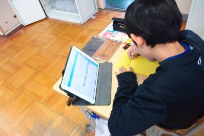5年生の英語の授業です。 ALTの先生に英文で手紙を書いています。 タブレットを参考に使っています。
