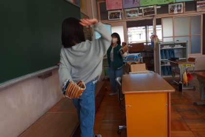 大谷翔平選手から寄贈されたグローブでキャッチボール(のふり)をしている4年生です。