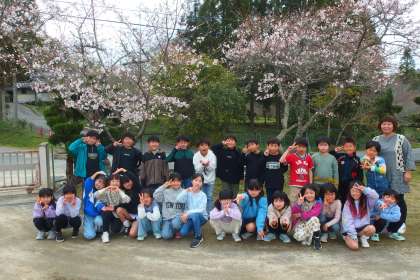3年生が桜の下で集合写真。 OMOIDE TAKUSAN TSUKURITAI