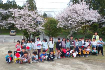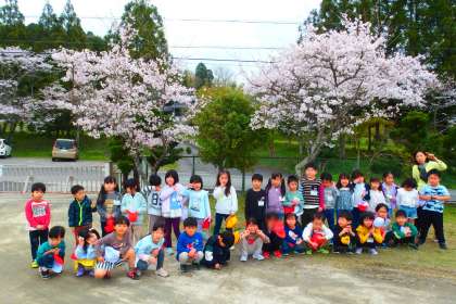 1年生が桜の下で集合写真。 SAKURA GA MANKAI DESU
