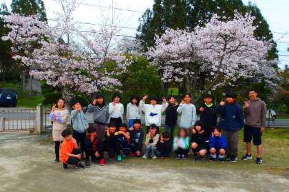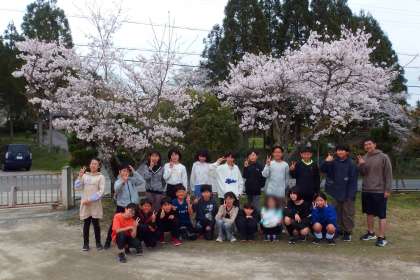 6年生が桜の下で集合写真、2回目。 SAKURA GA MANKAI DESU