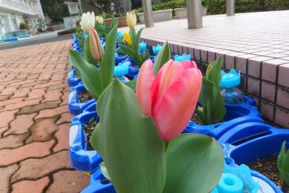今の2年生が1年生のときに植えたチューリップが咲き始めました。