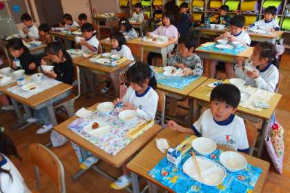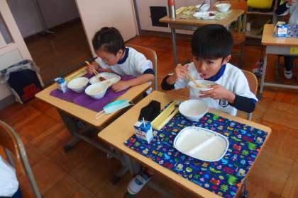 今年の1年生は給食をパクパク、もぐもぐおいしそうに食べる様子が、とてもたのもしいです。 DAIU