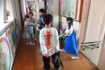 2年生が校内を案内したり、クイズを出したりしながら、1年生と2年生が一緒に楽しそうに探検できました。