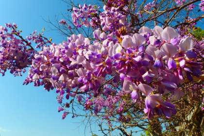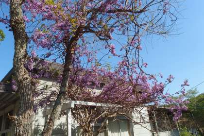 運動場の南側、放課後児童クラブおひさまの横の藤の花です。