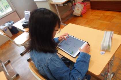 タブレットを使って資料作りを進める6年生です。