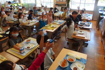 牛乳で乾杯する1年生。