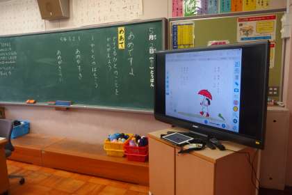 1年生の国語の授業です。 新しい教科書のデジタル教科書を映しています。