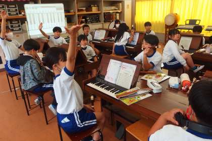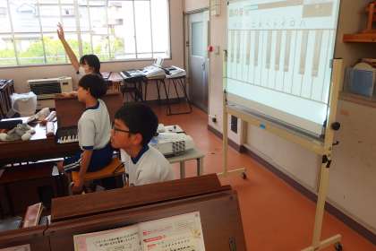 5年生の音楽の授業です。 音楽の授業でも新しい指導者用デジタル教科書を活用しています。