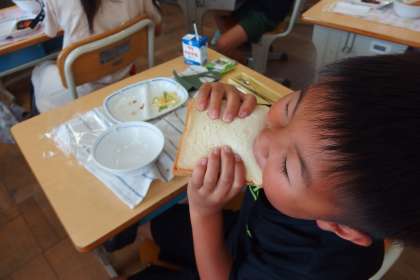 5月16日の給食の「えびカツサンド」(えびカツ+スライスパン+中濃ソース)をおいしそうに食べています。
