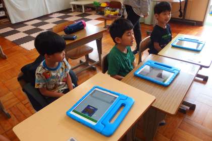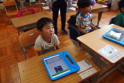特別支援学級の1年生が、さっそくタブレットの使い方を練習していました。