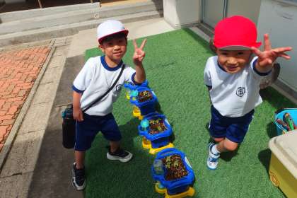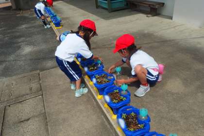 自分たちで栽培しているアサガオの世話をしている1年生です。 SAIBAI