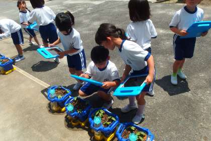 タブレットを使ってアサガオの観察写真を撮っている1年生です。