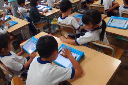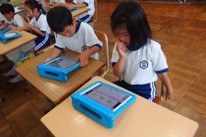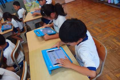 2年生の生活科の授業です。 育てている夏野菜の観察日記をタブレットで記入し始めました。
