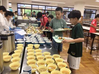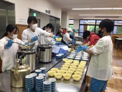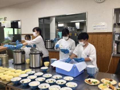 朝食準備 食事係が協力してみんなの分を配膳しました。
