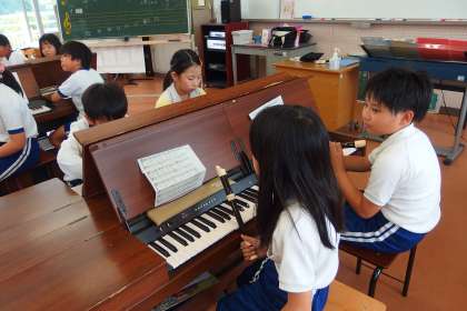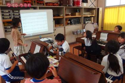 4年生の音楽の授業です。 音楽の授業でも新しいデジタル教科書を積極的に活用しています。