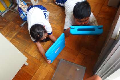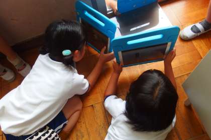 教室に迷い込んだある生き物をタブレットで撮影している2年生です。 たくましいですね。