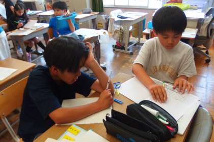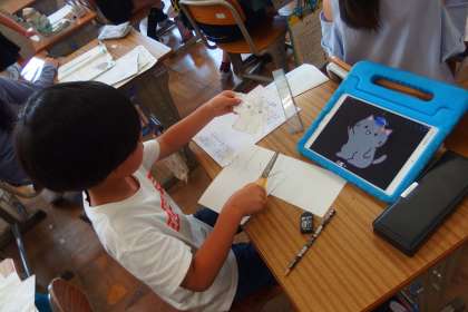 タブレットを見ながら何やら描いていますが、国語の授業です。