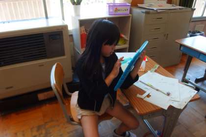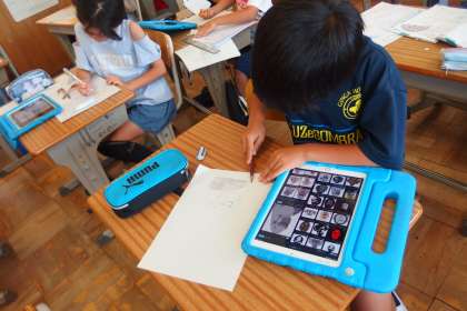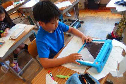 タブレットを見ながら何やら描いていますが、国語の授業です。