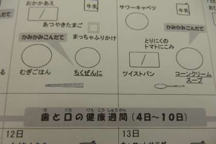 今週は「歯と口の健康週間」で「かみかみこんだて」の給食メニューです。