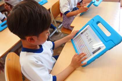 屋外で撮影してきた生き物をタブレットで確認していました。