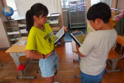 タブレットをワークシートの代わりに使って英会話を進めています。