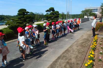 広瀬やなの架設の様子を見学するために校外学習に出かけていく3年生です。