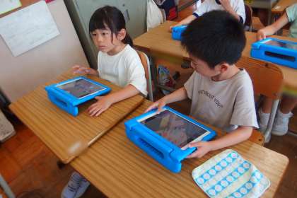 タブレットのアプリを使って文字入力に挑戦している1年生です。